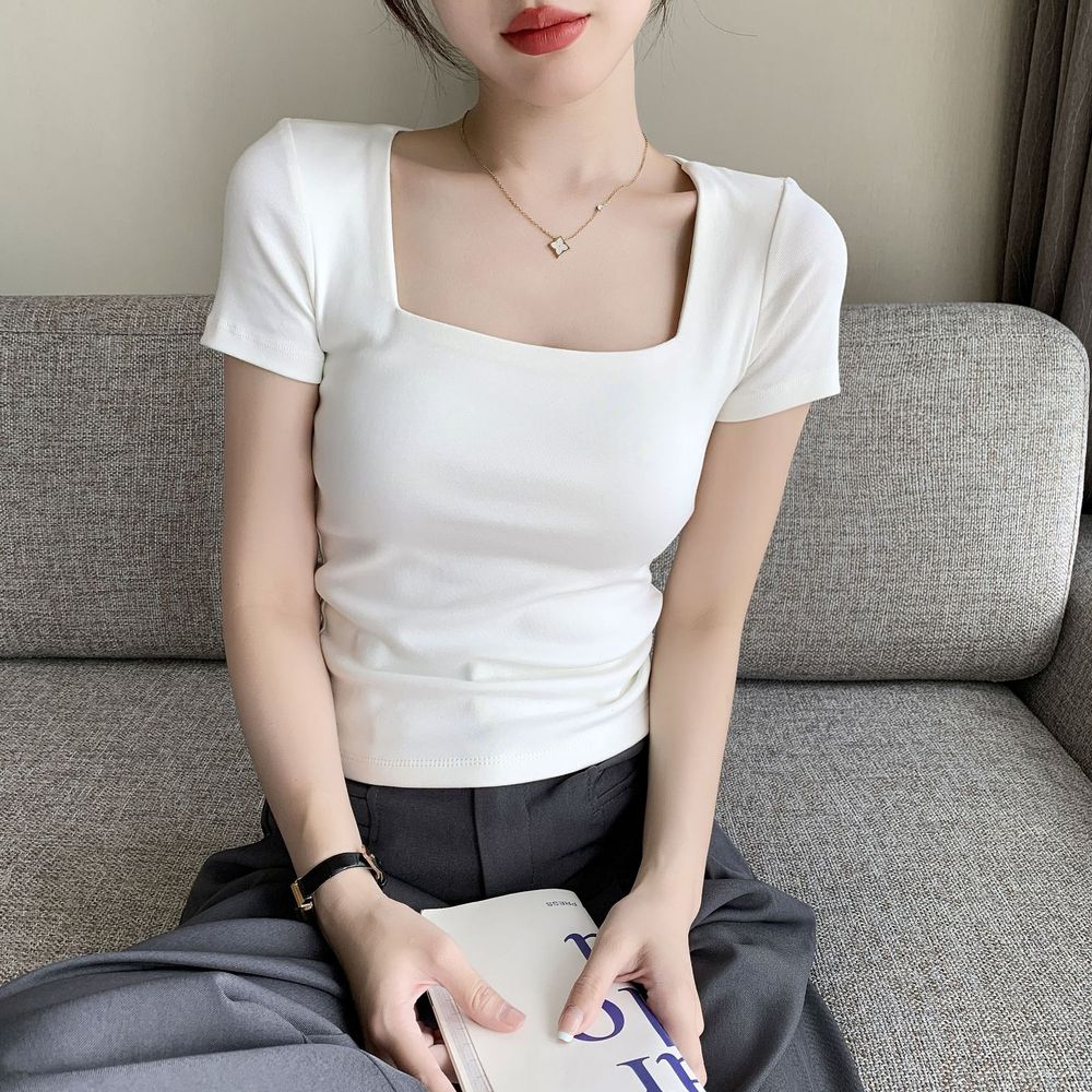 Square Neck Short Sleeve T-Shirt Slim Fit Cropped Top